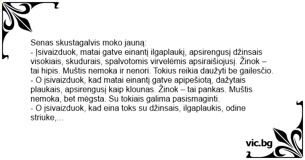 - O dar, įsivaizduok, eini mišku ir iš krūmų išlenda ilgaplaukis, apsirengęs džinsais visokiais, skudurais, spalvotomis virvelėmis apsiraišiojęs. Tai – indėnų fanas. Atrodo, kaip hipis. Bet neduokdie, jei tu juos supainiosi…