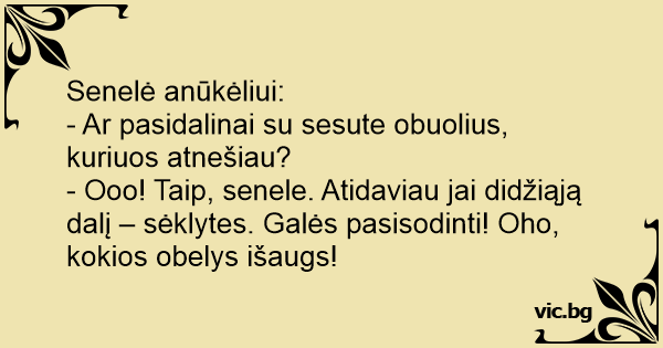 - Ooo! Taip, senele. Atidaviau jai didžiąją dalį – sėklytes. Galės pasisodinti! Oho, kokios obelys išaugs!