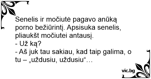Senelis ir močiutė pagavo anūką роrnо bežiūrintį. Apsisuka senelis, pliaukšt močiutei antausį.