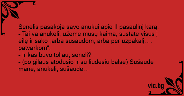 - Tai va anūkeli, užėmė mūsų kaimą, sustatė visus į eilę ir sako „arba sušaudom, arba per uzpakalį…. patvarkom“.
