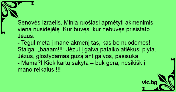 Staiga- „baaam!!!“ Jėzui į galvą pataiko atlėkusi plyta. Jėzus, glostydamas guzą ant galvos, pasisuka: