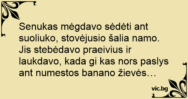 Senukas mėgdavo sėdėti ant suoliuko, stovėjusio šalia namo. Jis stebėdavo praeivius ir laukdavo, kada gi kas nors paslys ant numestos banano žievės…