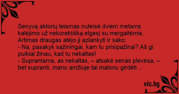 - Suprantama, as nekaltas, – atsakė senas plevėsa, – bet supranti, mano amžiuje tai malonu girdėti…
