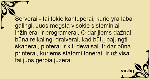 Serverai - tai tokie kantuperai, kurie yra labai galingi. Juos megsta visokie sisteminiai inžinierai ir programerai. O dar jiems dažnai būna reikalingi draiverai, kad būtų pajungti skanerai, ploterai ir kiti devaisai. Ir dar būna printerai, kuriems statomi tonerai. Ir už visa tai juos gerbia juzerai.
