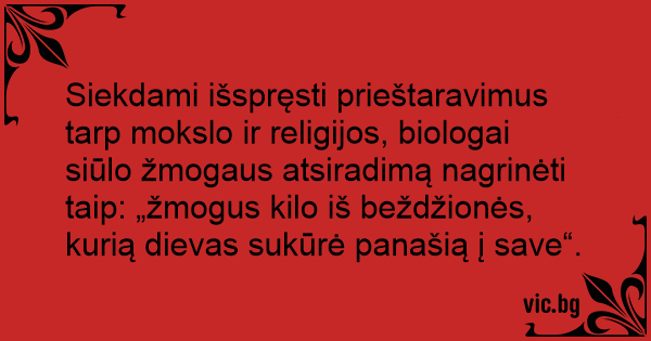 Siekdami išspręsti prieštaravimus tarp mokslo ir religijos, biologai siūlo žmogaus atsiradimą nagrinėti taip: „žmogus kilo iš beždžionės, kurią dievas sukūrė panašią į save“.