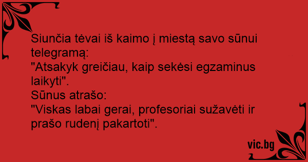 Siunčia tėvai iš kaimo į miestą savo sūnui telegramą: