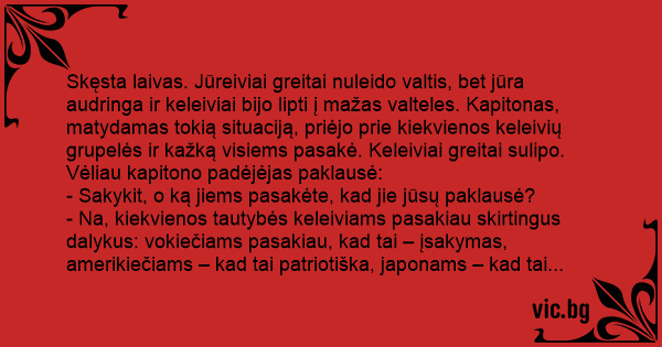 Skęsta laivas. Jūreiviai greitai nuleido valtis, bet jūra audringa ir keleiviai bijo lipti į mažas valteles. Kapitonas, matydamas tokią situaciją, priėjo prie kiekvienos keleivių grupelės ir kažką visiems pasakė. Keleiviai greitai sulipo.