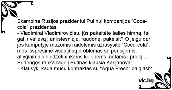 - Vladimirai Vladimirovičiau, jūs pakeitėte šalies himną, tai gal ir vėliavą į ankstesniąją, raudoną, pakeisit? O jeigu dar jos kamputyje mažomis raidelėmis užrašysite “Coca-cola”, mes išspręsime visas jūsų problemas su pensijomis, atlyginimais biudžetininkams keleriems metams į priekį…