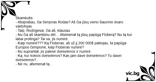 - Ne nu, atsimenat tą jūsų ristūną Bucefalą? Tai va jis numirė, papūga palesė ir…