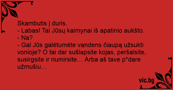 - Gal Jūs galėtumėte vandens čiaupą užsukti vonioje? O tai dar sušlapsite kojas, peršalsite, susirgsite ir numirsite… Arba aš tave p*dare užmušiu…