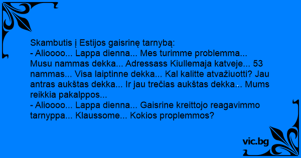 - Alioooo... Lappa dienna... Mes turimme problemma... Musu nammas dekka... Adressass Kiullemaja katveje... 53 nammas... Visa laiptinne dekka... Kal kalitte atvažiuotti? Jau antras aukštas dekka... Ir jau trečias aukštas dekka... Mums reikkia pakalppos...