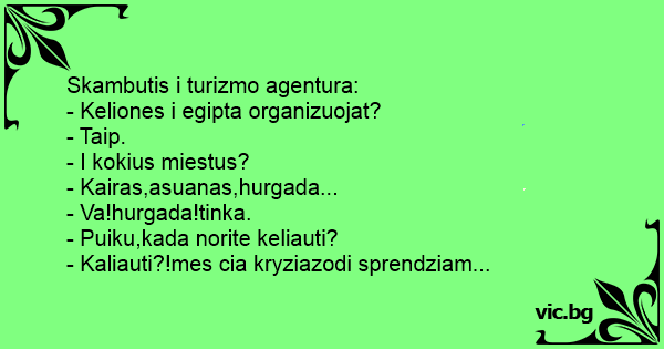 Телефонът в туроператорска агенция звъни: Ѕвони телефонот во туристичка агенција: Im Reisebüro klingelt das Telefon. "Haben Sie Reisen nach Ägypten?" "Ja." "Welche Ferienorte bieten Sie an?" "Alexandria, Dumanhur, Kairo ..." "Dumanhur passt." "Und wann möchten Sie da hinreisen?"... Дзвінок в турагентство. — Ви Єгипет продаєте? .. — Так, звичайно продаємо... — Скажіть, а які курорти там є? — Шарм-ель-шейх, Хургада, Таба, Нувейба... — О! Стоп, Нувейба, точно Нувейба підходить... Un apel telefonic la o agenţie de turism: - Faceţi excursii în Egipt? - Da, desigur... - Spuneţi-mi, vă rog, ce staţiuni balneare sunt acolo? - Sharm-el-Sheik, Hurgada, Taba, Nuveiba... - Stop...... Skambina Petras į kelionių agentūrą ir klausia: - Pas jus vyksta kelionės į Japoniją? - Taip. - O į kokius miestus? - Į Tokiją, Osaką, Kobę, Fukuoką... - O! Fukuoka tinka! - Smagu, kad norite...