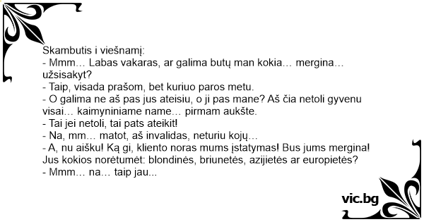 - A, nu aišku! Ką gi, kliento noras mums įstatymas! Bus jums mergina! Jus kokios norėtumėt: blondinės, briunetės, azijietės ar europietės?