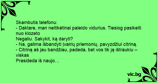 Skambutis telefonu: - Daktare, man neitikėtinai paleido vidurius. Tiesiog pasikelti nuo klozeto Negaliu. Sakykit, ką daryti? - Na, galima išbandyti įvairių priemonių, pavyzdžiui citriną. - Citriną aš jau bandžiau, padeda, bet vos tik ją ištraukiu – viskas Prasideda iš naujo…