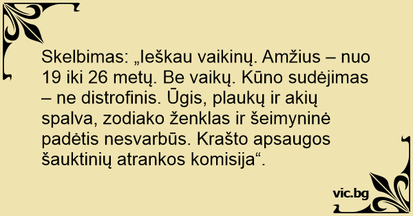 Skelbimas: „Ieškau vaikinų. Amžius – nuo 19 iki 26 metų. Be vaikų. Kūno sudėjimas – ne distrofinis. Ūgis, plaukų ir akių spalva, zodiako ženklas ir šeimyninė padėtis nesvarbūs. Krašto apsaugos šauktinių atrankos komisija“.