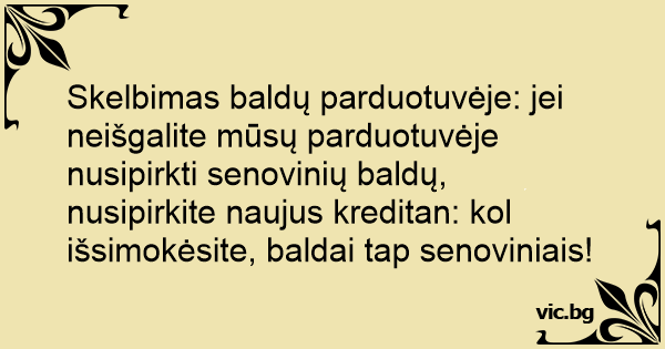 Skelbimas baldų parduotuvėje: jei neišgalite mūsų parduotuvėje nusipirkti senovinių baldų, nusipirkite naujus kreditan: kol išsimokėsite, baldai tap senoviniais!