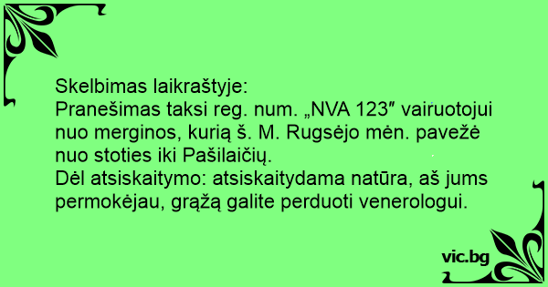 Pranešimas taksi reg. num. „NVA 123″ vairuotojui nuo merginos, kurią š. M. Rugsėjo mėn. pavežė nuo stoties iki Pašilaičių.