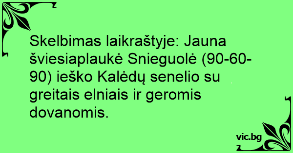 Skelbimas laikraštyje: Jauna šviesiaplaukė Snieguolė (90-60-90) ieško Kalėdų senelio su greitais elniais ir geromis dovanomis.