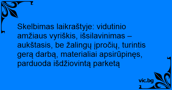 Skelbimas laikraštyje: vidutinio amžiaus vyriškis, išsilavinimas – aukštasis, be žalingų įpročių, turintis gerą darbą, materialiai apsirūpinęs, parduoda išdžiovintą parketą