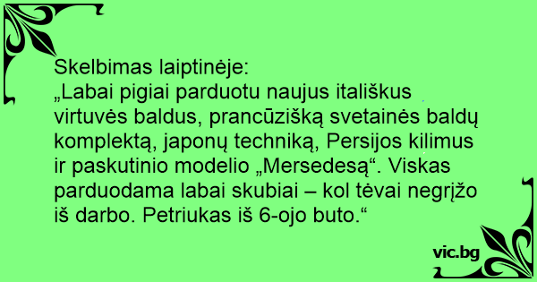 „Labai pigiai parduotu naujus itališkus virtuvės baldus, prancūzišką svetainės baldų komplektą, japonų techniką, Persijos kilimus ir paskutinio modelio „Mersedesą“. Viskas parduodama labai skubiai – kol tėvai negrįžo iš darbo. Petriukas iš 6-ojo buto.“