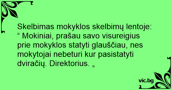 “ Mokiniai, prašau savo visureigius prie mokyklos statyti glauščiau, nes mokytojai nebeturi kur pasistatyti dviračių. Direktorius. „