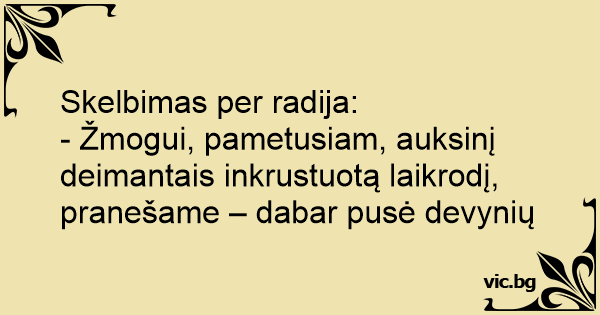 - Žmogui, pametusiam, auksinį deimantais inkrustuotą laikrodį, pranešame – dabar pusė devynių