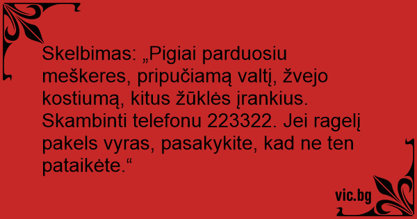 Skelbimas: „Pigiai parduosiu meškeres, pripučiamą valtį, žvejo kostiumą, kitus žūklės įrankius. Skambinti telefonu 223322. Jei ragelį pakels vyras, pasakykite, kad ne ten pataikėte.“