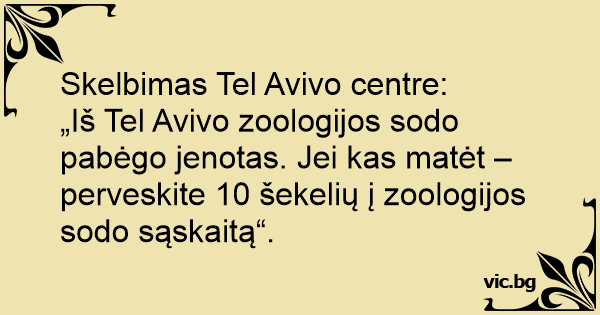 „Iš Tel Avivo zoologijos sodo pabėgo jenotas. Jei kas matėt – perveskite 10 šekelių į zoologijos sodo sąskaitą“.