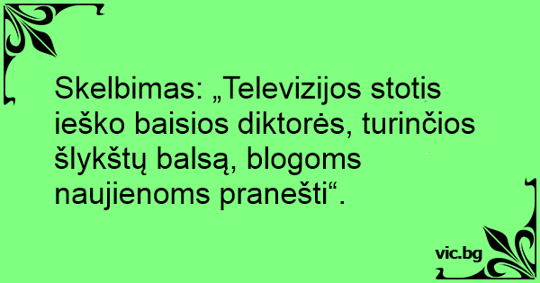 Skelbimas: „Televizijos stotis ieško baisios diktorės, turinčios šlykštų balsą, blogoms naujienoms pranešti“.