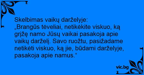 „Brangūs tėveliai, netikėkite viskuo, ką grįžę namo Jūsų vaikai pasakoja apie vaikų darželį. Savo ruožtu, pasižadame netikėti viskuo, ką jie, būdami darželyje, pasakoja apie namus.“