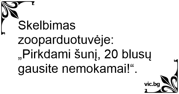 Skelbimas zooparduotuvėje: „Pirkdami šunį, 20 blusų gausite nemokamai!“.