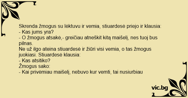 Ne už ilgo ateina stiuardesė ir žiūri visi vemia, o tas žmogus juokiasi. Stiuardesė klausia: