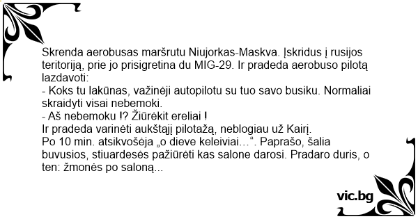 - Koks tu lakūnas, važinėji autopilotu su tuo savo busiku. Normaliai skraidyti visai nebemoki.