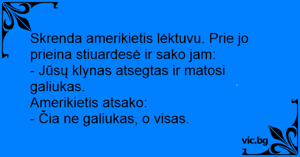 Skrenda amerikietis lėktuvu. Prie jo prieina stiuardesė ir sako jam:
