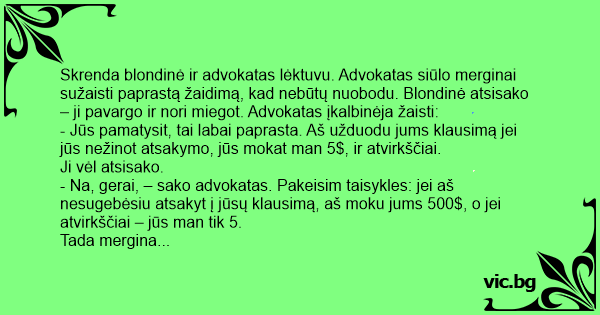 - Na, gerai, – sako advokatas. Pakeisim taisykles: jei aš nesugebėsiu atsakyt į jūsų klausimą, aš moku jums 500$, o jei atvirkščiai – jūs man tik 5.