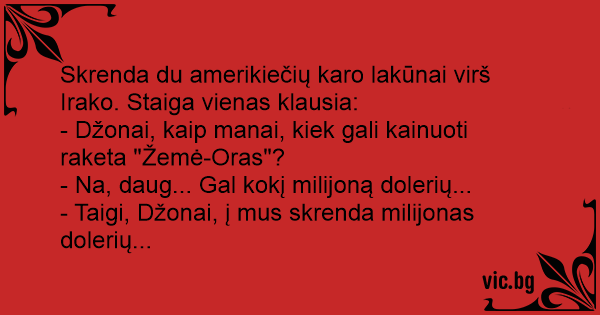 Skrenda du amerikiečių karo lakūnai virš Irako. Staiga vienas klausia: