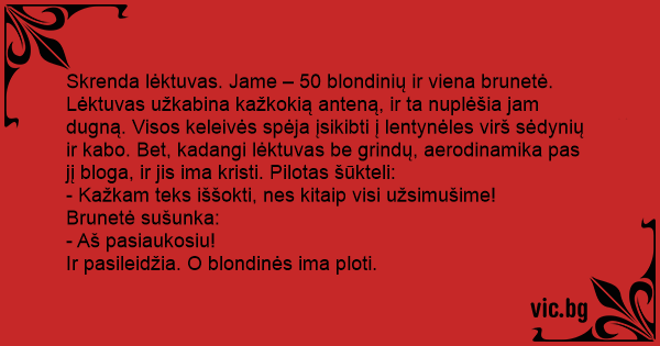 Skrenda lėktuvas. Jame – 50 blondinių ir viena brunetė. Lėktuvas užkabina kažkokią anteną, ir ta nuplėšia jam dugną. Visos keleivės spėja įsikibti į lentynėles virš sėdynių ir kabo. Bet, kadangi lėktuvas be grindų, aerodinamika pas jį bloga, ir jis ima kristi. Pilotas šūkteli: