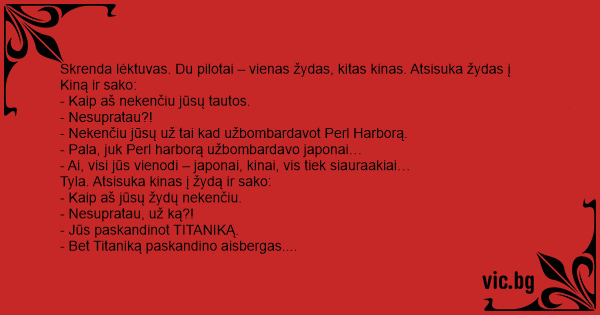 Skrenda lėktuvas. Du pilotai – vienas žydas, kitas kinas. Atsisuka žydas į