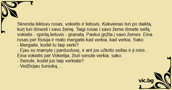 Skrenda lėktuvu rusas, vokietis ir lietuvis. Kekvienas turi po daiktą, kurį turi išmesti i savo žemę. Taigi rusas i savo žeme išmetė seifą, vokietis - spintą,lietuvis - granatą. Paskui grįžta į savo žemes. Eina rusas per Rusija ir mato mergaitė kad verkia, kad verkia. Sako: