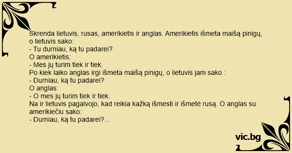 Skrenda lietuvis, rusas, amerikietis ir anglas. Amerikietis išmeta maišą pinigų, o lietuvis sako: