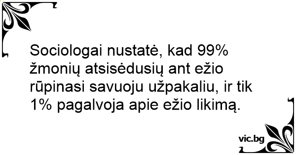 Sociologai nustatė, kad 99% žmonių atsisėdusių ant ežio rūpinasi savuoju užpakaliu, ir tik 1% pagalvoja apie ežio likimą.
