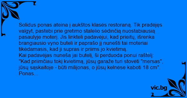 "Mano garaže stovi "mersas" ir Rolsroisas, bet pastarajį galima pastatyti ir lauke. Mano saskaitoje - du milijonai, bet vieną galiu pervesti į kitą sąskaita, tačiau kad ir kokia jūs nuostabi būtumėt, nė už ką neleisiu nurėžt man 6 cm, todėl gal tiesiog grąžinkite man tą butelį ir viską pamirškim..."