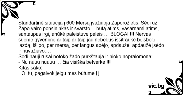 Standartinė situacija į 600 Mersą įvažiuoja Zaporožietis. Sėdi už Zapo vairo pensininkas ir svarsto… butą atims, vasarnami atims, santaupas irgi, anūkė paleistuve paleis … BLOGAI !!! Nervas suėmė gyvenimo ar taip ar taip jau nebebus išsitraukė beisbolo lazdą, išlipo, per mersą, per langus apėjo, apdaužė, apdaužė įsėdo ir nuvažiavo….