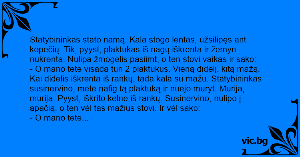 - O mano tete visada turi 2 plaktukus. Vieną didelį, kitą mažą. Kai didelis iškrenta iš rankų, tada kala su mažu. Statybininkas susinervino, metė nafig tą plaktuką ir nuėjo muryt. Murija, murija. Pyyst, iškrito kelne iš rankų. Susinervino, nulipo į apačią, o ten vėl tas mažius stovi. Ir vėl sako: