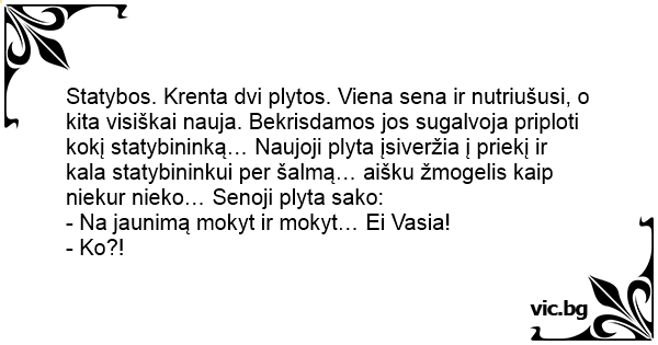 Statybos. Krenta dvi plytos. Viena sena ir nutriušusi, o kita visiškai nauja. Bekrisdamos jos sugalvoja priploti kokį statybininką… Naujoji plyta įsiveržia į priekį ir kala statybininkui per šalmą… aišku žmogelis kaip niekur nieko… Senoji plyta sako: