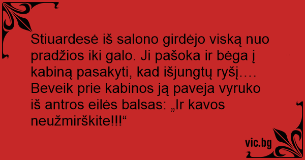 Stiuardesė iš salono girdėjo viską nuo pradžios iki galo. Ji pašoka ir bėga į kabiną pasakyti, kad išjungtų ryšį…. Beveik prie kabinos ją paveja vyruko iš antros eilės balsas: „Ir kavos neužmirškite!!!“