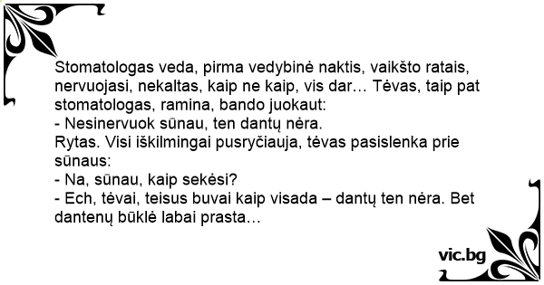 Stomatologas veda, pirma vedybinė naktis, vaikšto ratais, nervuojasi, nekaltas, kaip ne kaip, vis dar… Tėvas, taip pat stomatologas, ramina, bando juokaut: