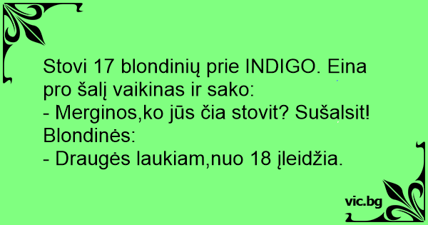 Stovi 17 blondinių prie INDIGO. Eina pro šalį vaikinas ir sako: