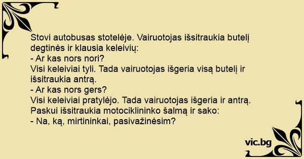 Stovi autobusas stotelėje. Vairuotojas išsitraukia butelį degtinės ir klausia keleivių: