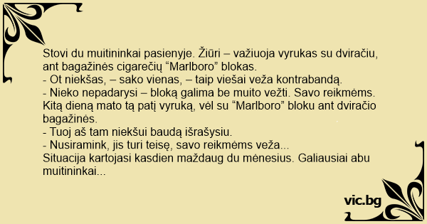 Stovi du muitininkai pasienyje. Žiūri – važiuoja vyrukas su dviračiu, ant bagažinės cigarečių “Marlboro” blokas.